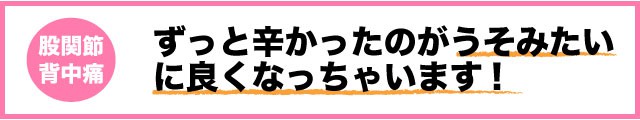 やさしい施術で痛みも伴わず、しかも短時間の施術なのに1回で腰痛がほぼ消え、身体全体が柔らかくなりとても楽になりました。この感覚は初めてです!感動しました!!根本改善の為にこれからも通います。